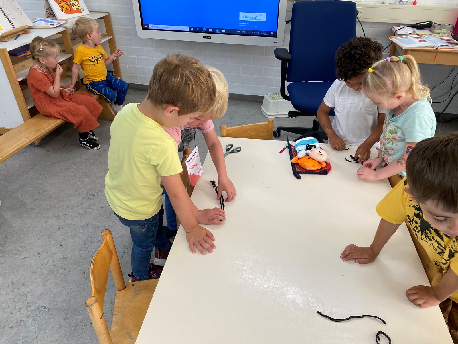 Ook werd er nog volop geleerd in de klas. De oudste kinderen leerden het laatste cijfer , het cijfer 9 schrijven. En de jongste kinderen waren druk met meten en tellen; ze verdeelden veterdrop in gelijke stukken.