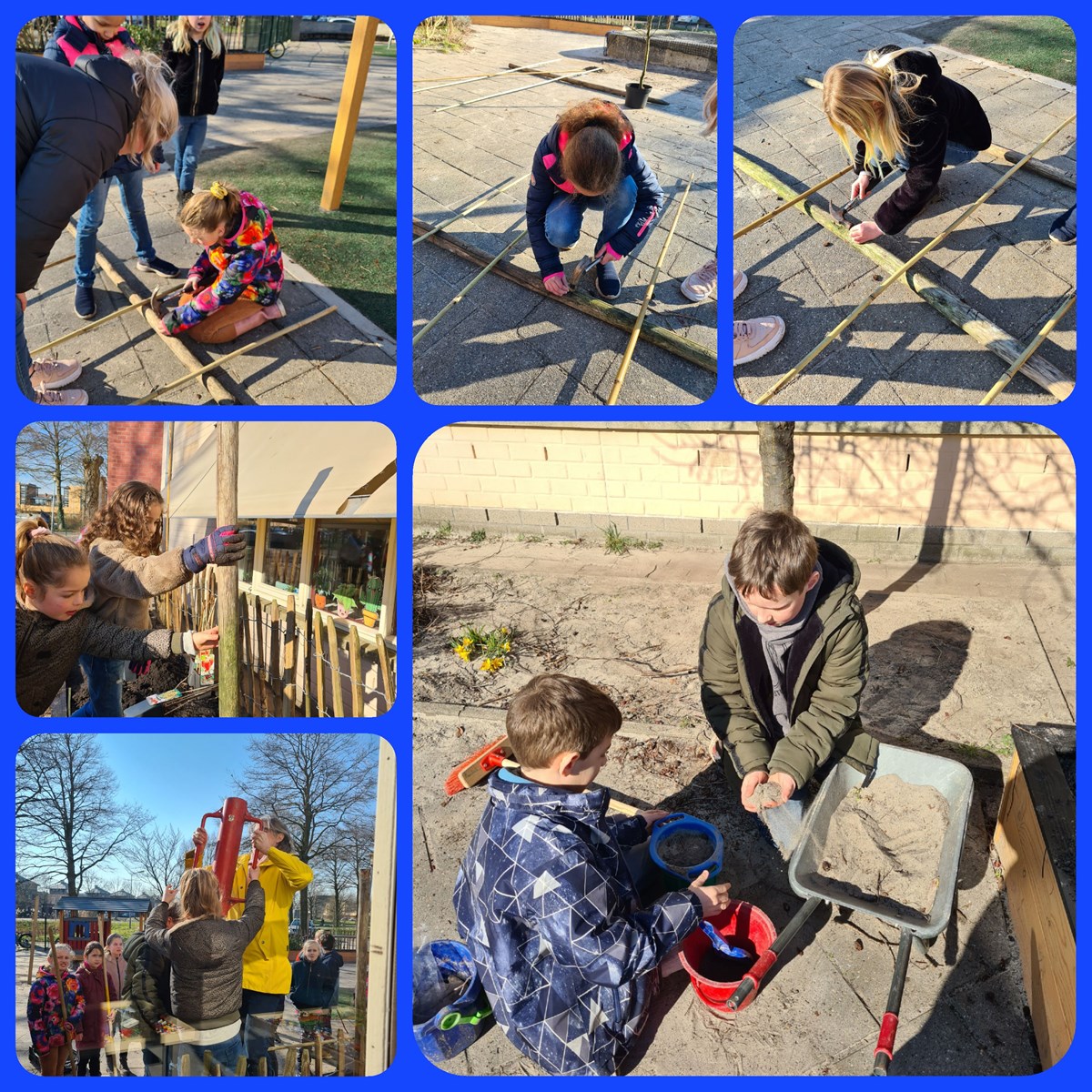Er moest gemeten, gegraven, getimmerd, gezaagd, geveegd, gewaterd, geknoopt, samengewerkt, geschreven en nagedacht worden. Mooi om te zien hoe sommige kinderen zelf initiatief nemen en er klussen bij verzinnen. Zo ontstond er ook spontaan een zand-zuiverings-bedrijfje (in plaats van waterzuivering). Ook werd het schoolplein geveegd. Er werden houten naambordjes gezaagd en geschreven. Was het nou een APELBOOM of een APPELBOOM?
