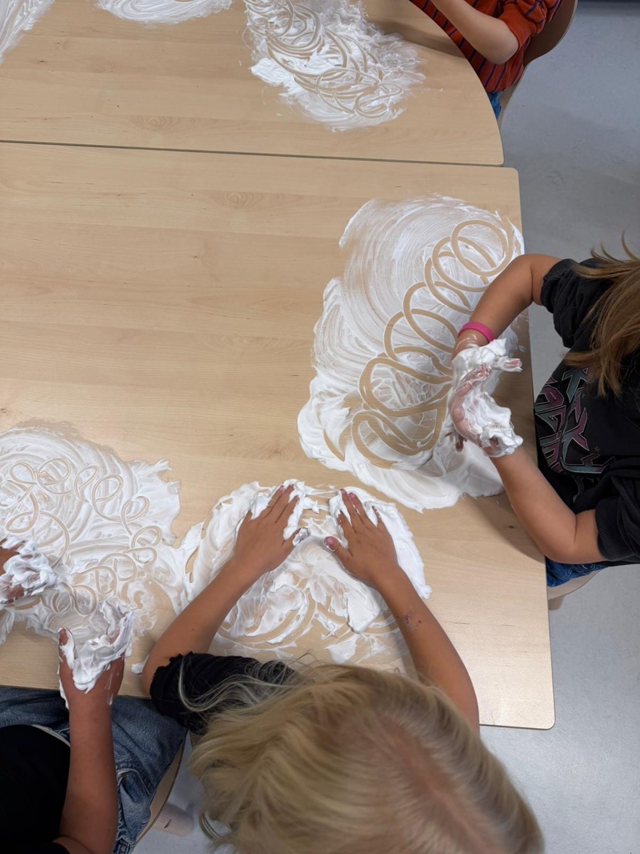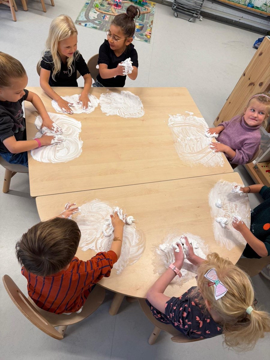 Bij het blikgooien merkten we dat de ballen goed konden rollen. Dit zijn wij gaan namaken met een schrijfdans. De kinderen mochten ontdekken met scheerschuim op de tafel – best wel een beetje gek!!!
