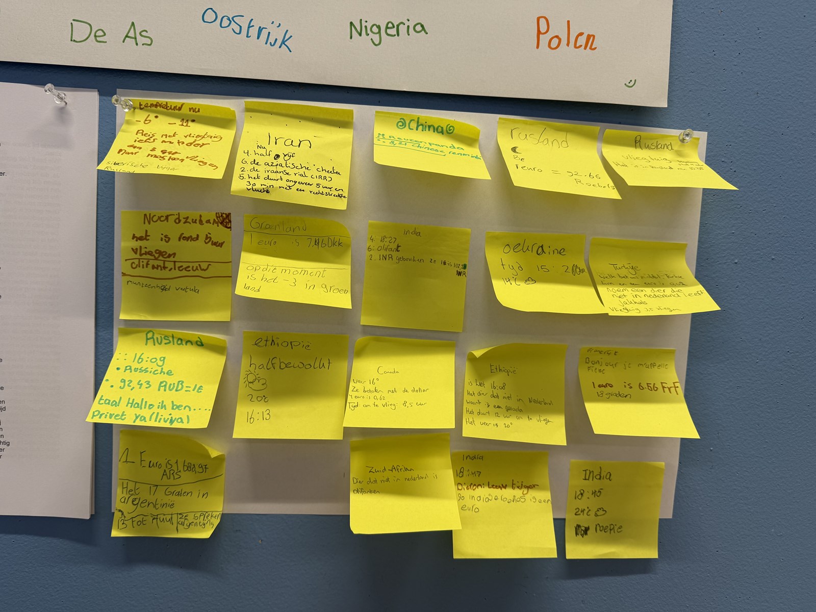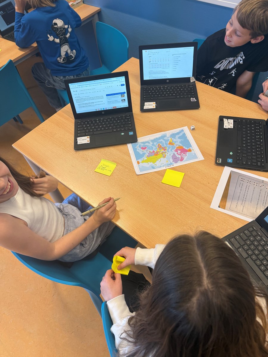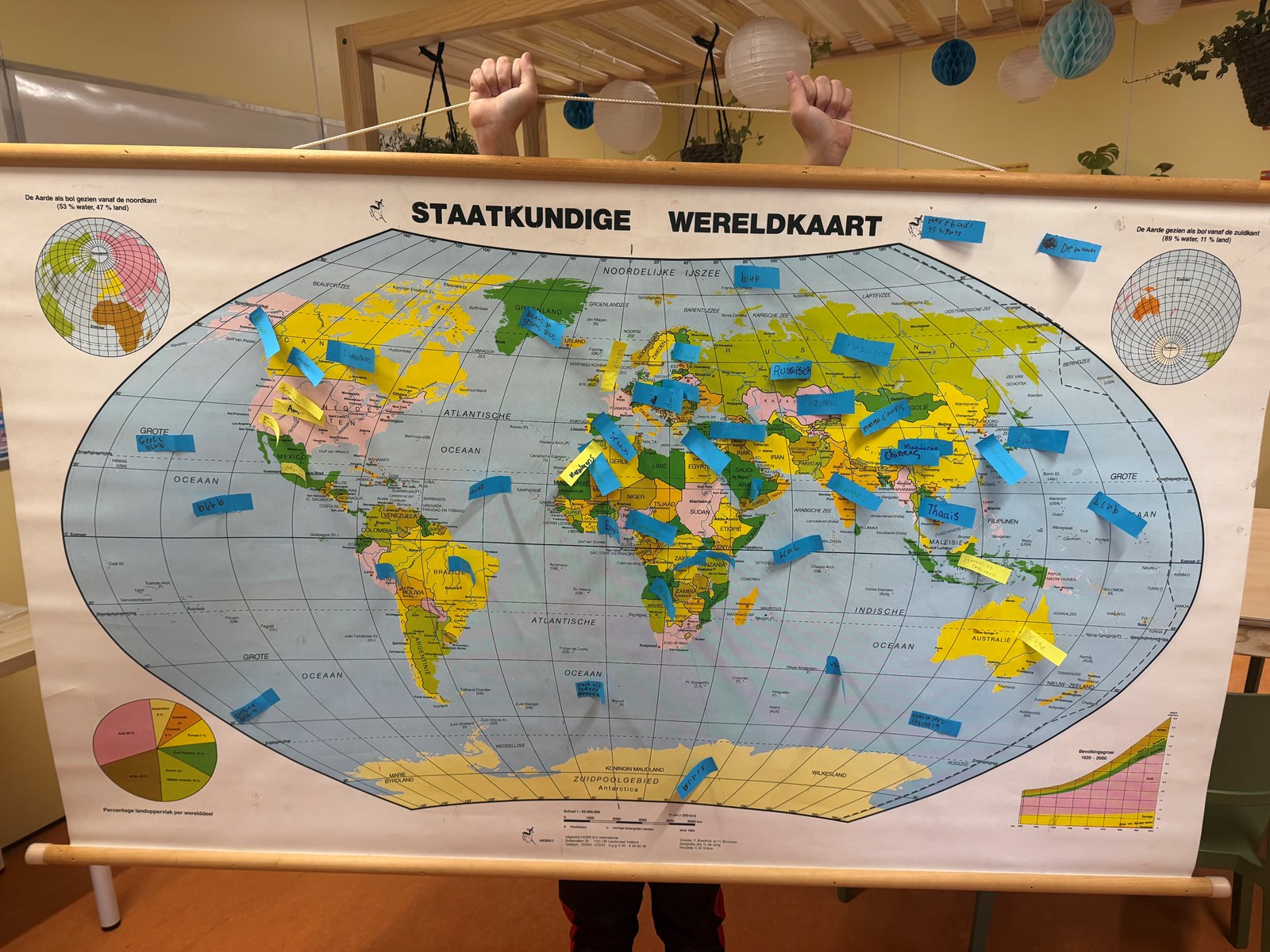 We hebben een spel gespeeld dat past bij ons thema. In groepjes werd er op de wereldkaart geprikt op een land. Vervolgens gingen alle kinderen uit het groepje dobbelen met een dobbelsteen. Op het lijstje stond welke vraag de kinderen dan moesten opzoeken en beantwoorden.