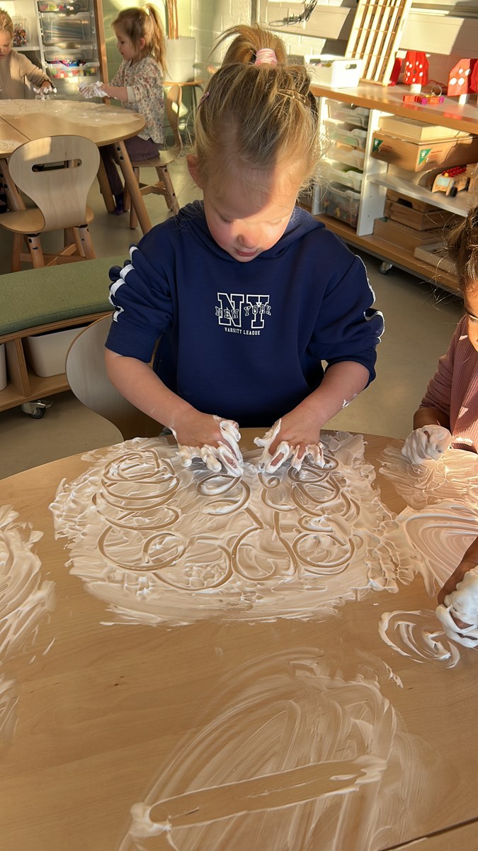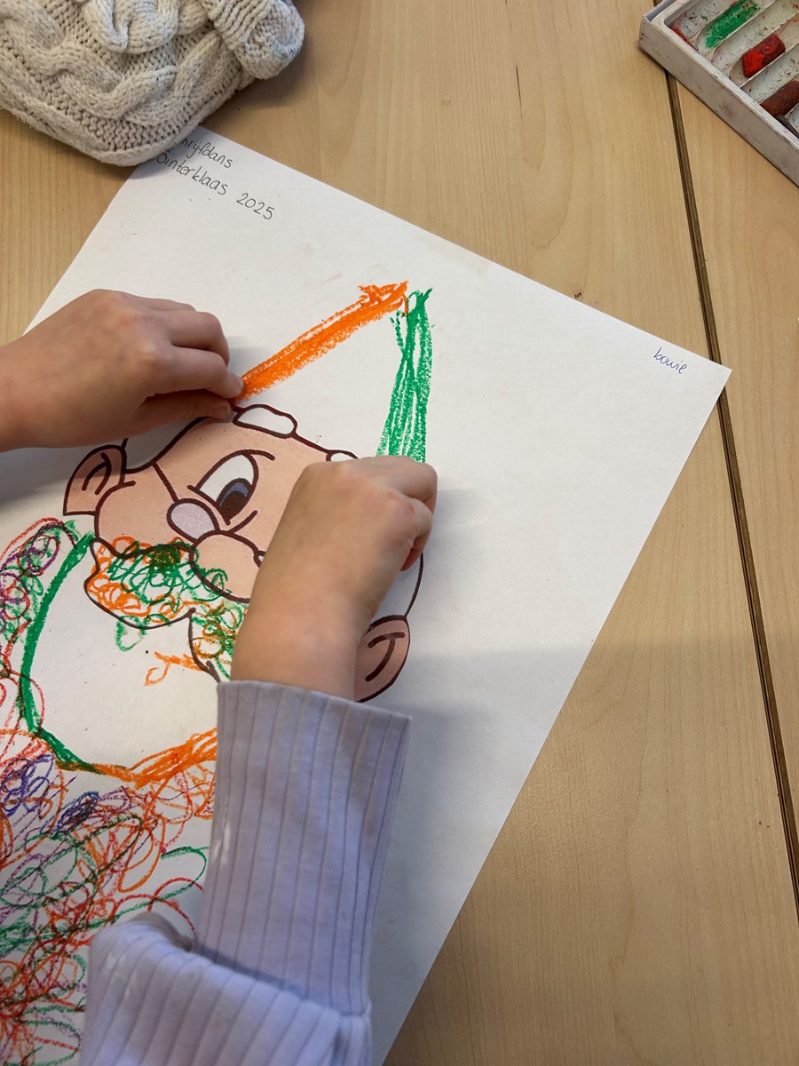 Vandaag deden we een leuke schrijfdans van Sinterklaas. Eerst met scheerschuim en twee vingers de krullen van de baard maken en daarna met twee vingers in een punt de mijter. En na het oefenen in scheerschuim door naar papier en dezelfde bewegingen met krijt maken. De resultaten zijn leuk! Ze hangen op de schuifkast.