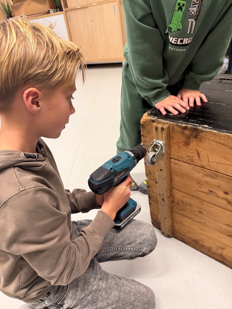 We hebben een “nieuwe” speelgoedkist gemaakt en zijn nog druk bezig met de oude schoolbank. Volgende week gaan we naar de Karwei en gaan we werken met de naaimachine of we gaan haken!