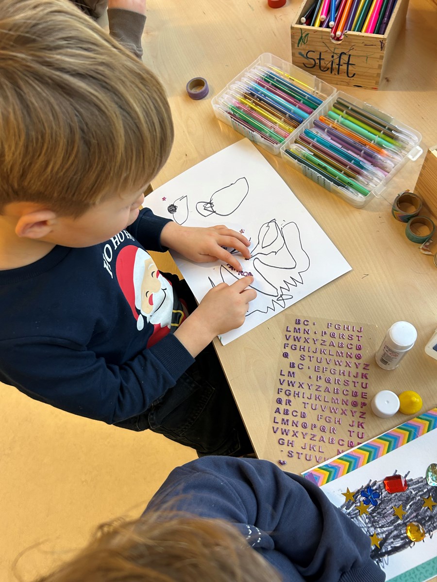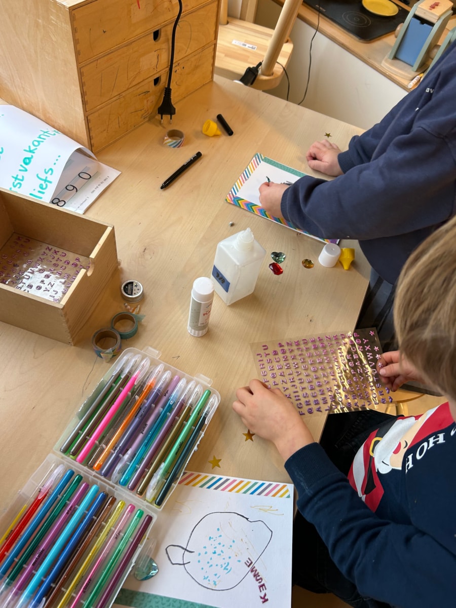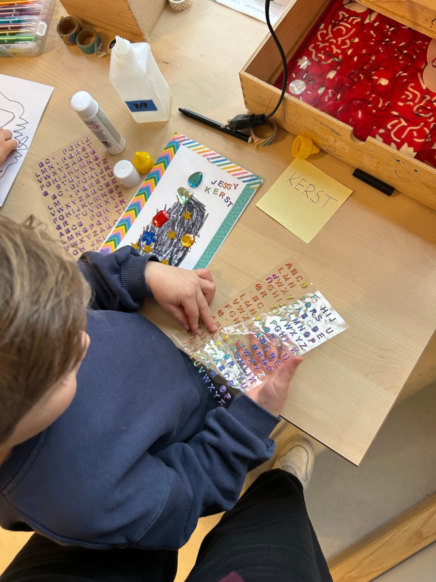 Nadat we de hele week hard gewerkt hadden aan onze kerstkaarten was het dan eindelijk zover; tijdens het kerstdiner mochten we de kaarten aan elkaar geven. Leuk! Er komen foto’s van de geschreven kaarten in het portfolio dus jullie kunnen het werk van jullie eigen kind later ook nog bewonderen.