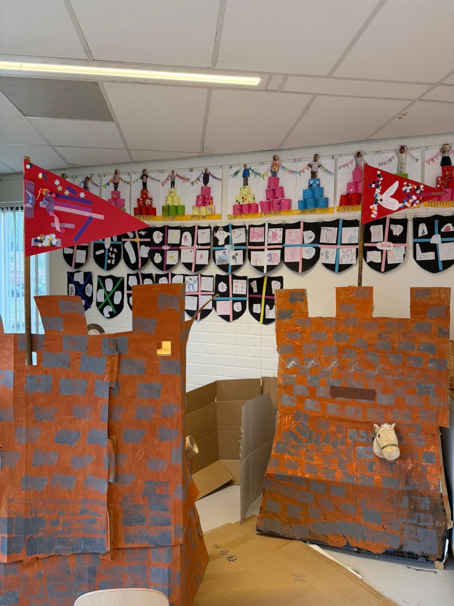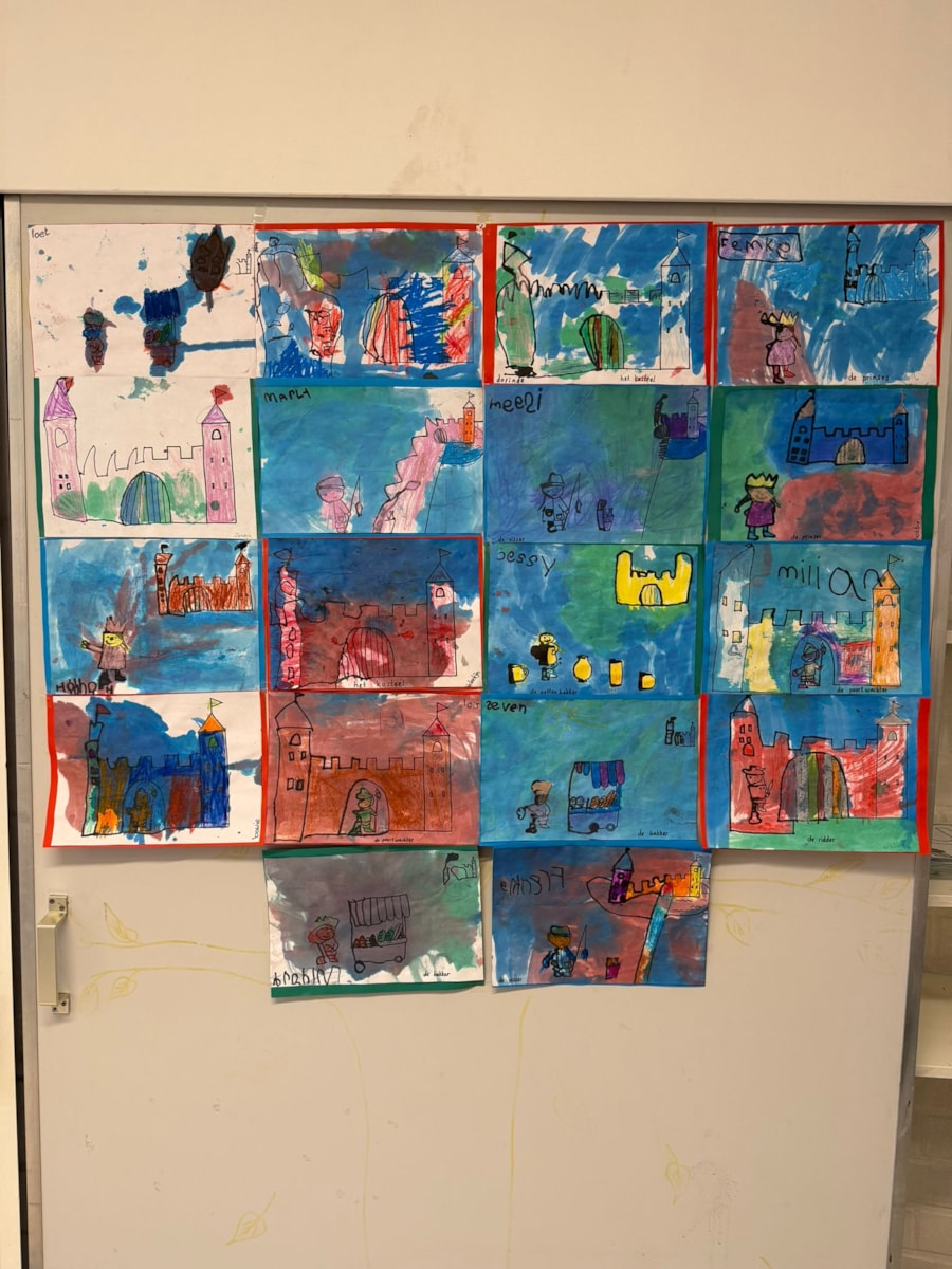 Een echte ridder valt natuurlijk niet alleen aan met een zwaard, maar moet zich ook goed kunnen verdedigen. Daarom zijn we aan de slag gegaan met het knutselen van een schild, zoals te zien is op de foto’s. En daar bleef het knutselen niet bij: met permanente stiften en ecoline hebben de kinderen prachtige kunstwerken gemaakt voor aan de muur. Wat een creativiteit!