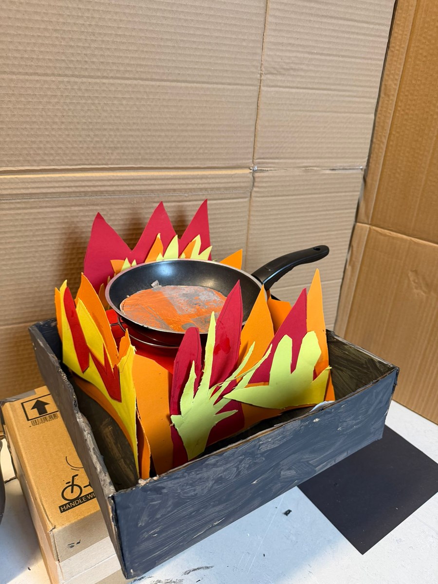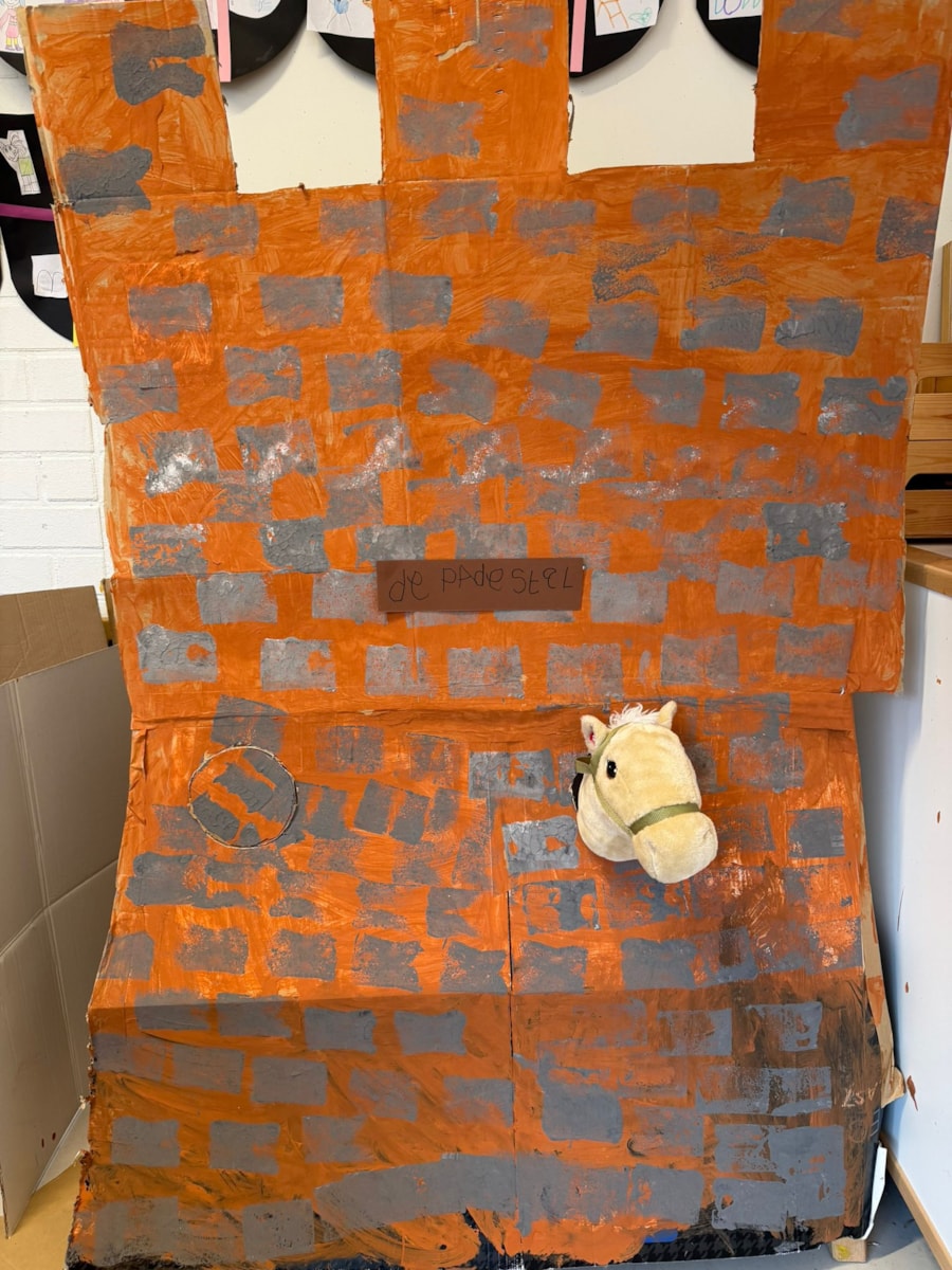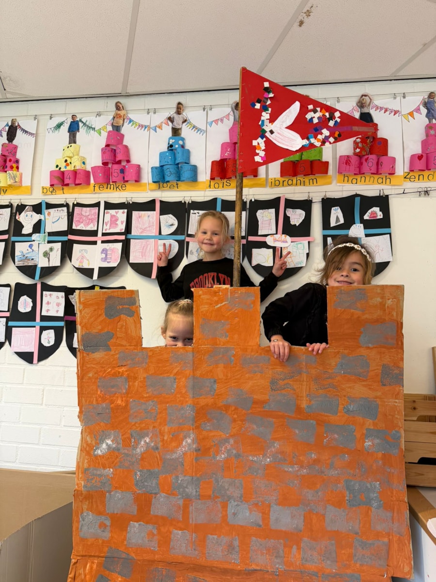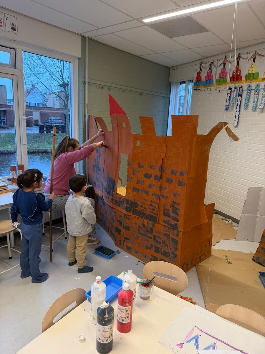 Afgelopen week hebben we verder gewerkt aan ons kasteel. We ontdekten dat een kasteel stevig moet zijn en dat je daarvoor het beste een metselstructuur kunt gebruiken. Daarom hebben we bakstenen gestempeld op ons kasteel. Ook ontbraken er nog een paar belangrijke onderdelen: een mooie vlag en een heerlijk warm vuur om je aan op te warmen. Er was dus genoeg te doen!