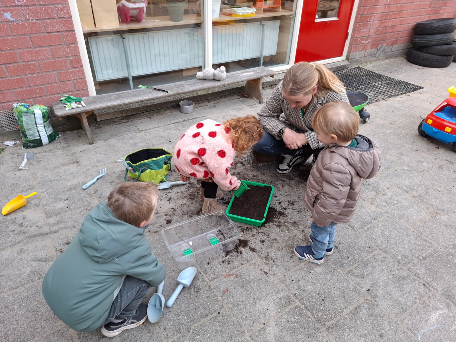 Vanochtend werd er hard gewerkt in de tuin! De wilgen zijn gesnoeid en de ontdektuin is verder afgeschermd met boomstammen. De peuters waren intussen druk met het zaaien van tuinbonen en zonnebloemen en het onkruid wieden in de moestuin!