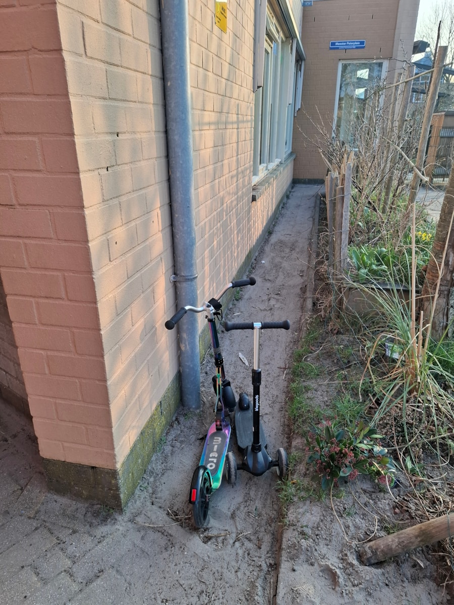 We zien af en toe nog steppen geparkeerd staan in de gang bij de onderbouw. De nooduitgang wordt hierdoor geblokkeerd en dat kan gevaarlijke situaties geven. Wil je ervoor daarom voor zorgen dat meegenomen steppen buiten worden geparkeerd? Steppen die we toch binnen aantreffen, zetten we op de plek die je op de foto ziet.