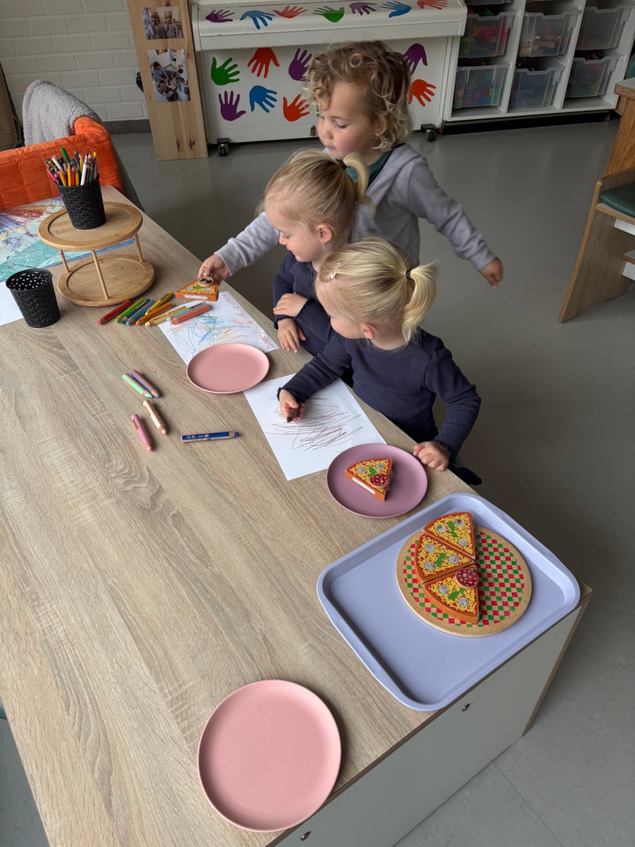 Tijdens het tekenen wordt er een pizzapunt geserveerd, bij de koffie een puntzak met friet, de tafel wordt gedekt en de stamppot wordt gestampt.