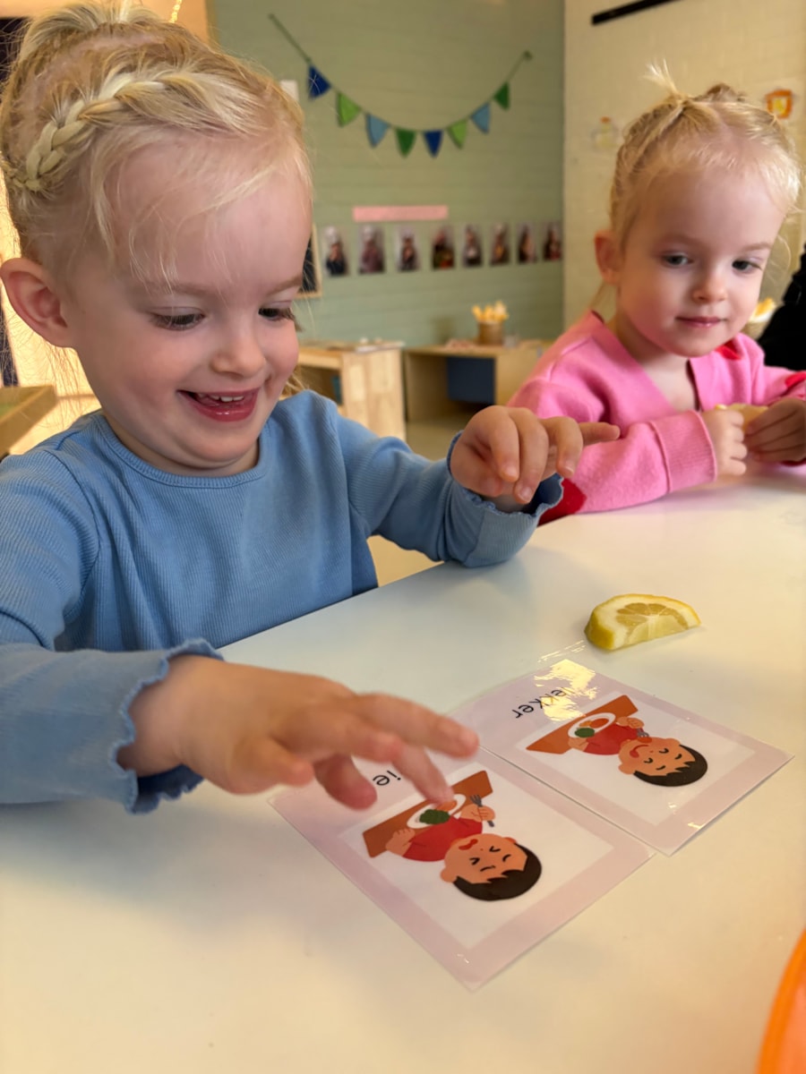 Deze week zijn we verdergegaan met ons thema: wij werken in een restaurant. Wat gebeurt er met zand als je een zeef gebruikt? Hoe proeft een citroen, hoe gebruik je een servet en wat is een smoothie? Met pictogrammen mochten de kinderen aanwijzen of ze het lekker of vies vonden.
