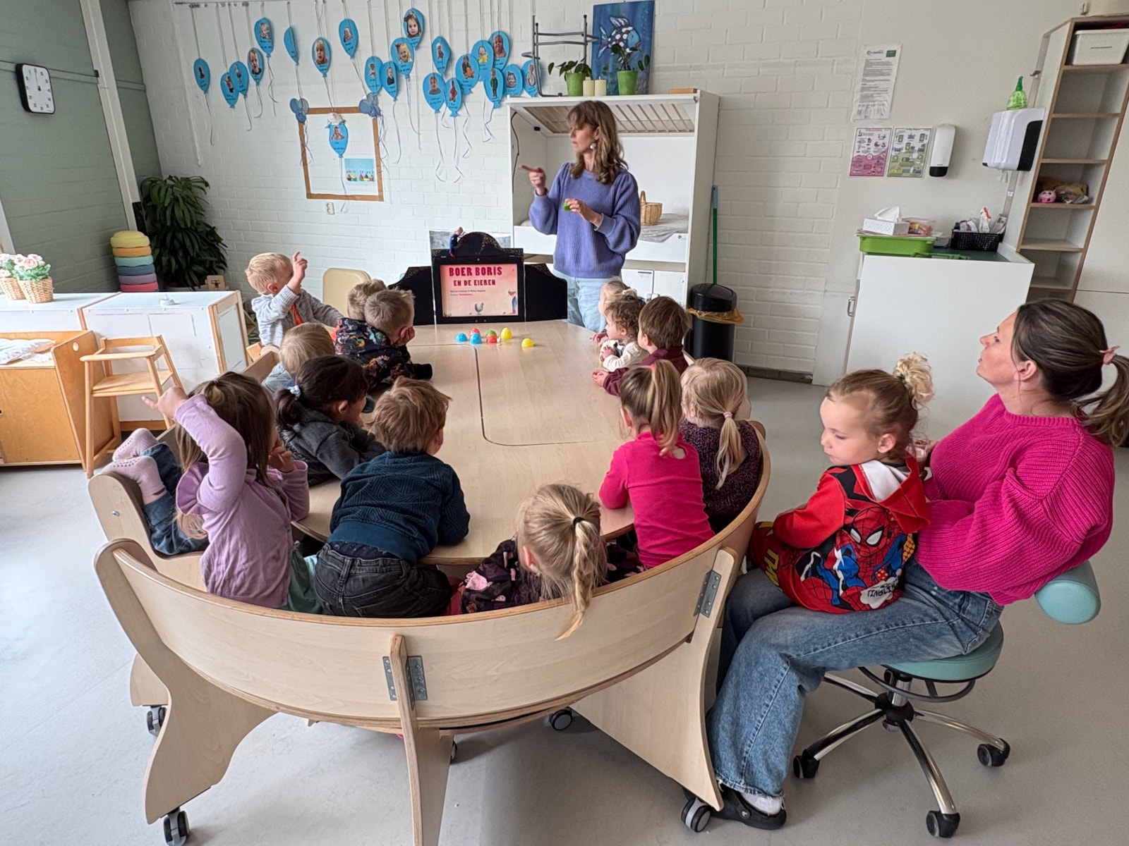 Verder kwam Margot van de bibliotheek voorlezen uit het boek Boer Boris en de eieren. Margot had een heleboel eieren in verschillende kleuren. Wat kun je allemaal met eieren doen? Nou?