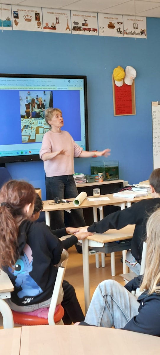 Ze is ongeveer 3 kwartier in de klas geweest. Vooraf hebben we vragen voor haar bedacht. Kinderen vonden het erg leuk!