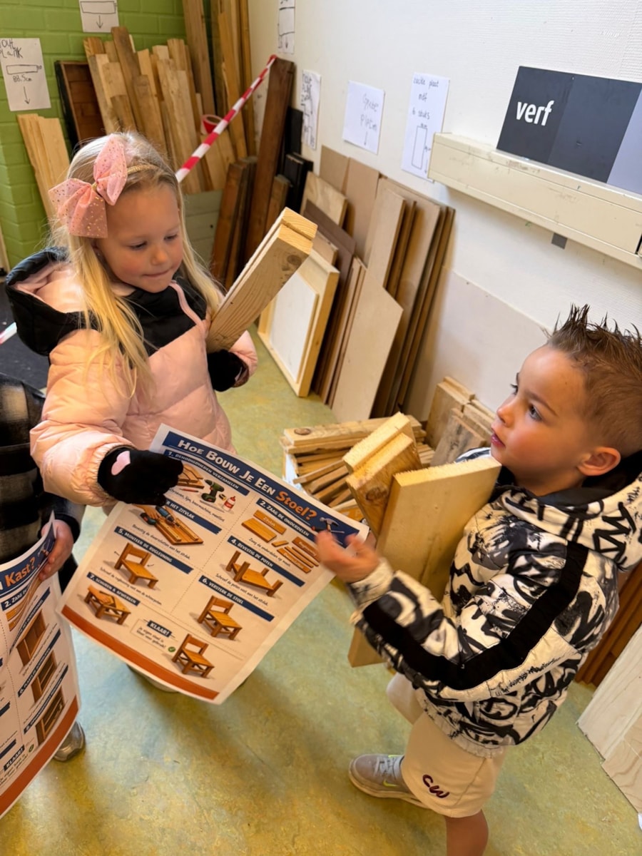 Wat een heerlijke klusweek hebben we achter de rug. Groep 1 t/m 4 is inmiddels veranderd in een bruisende bouwmarkt met werkplaats, want we doen mee aan de grote meubelwedstrijd. Ons doel? De allermooiste en stevigste meubels maken!