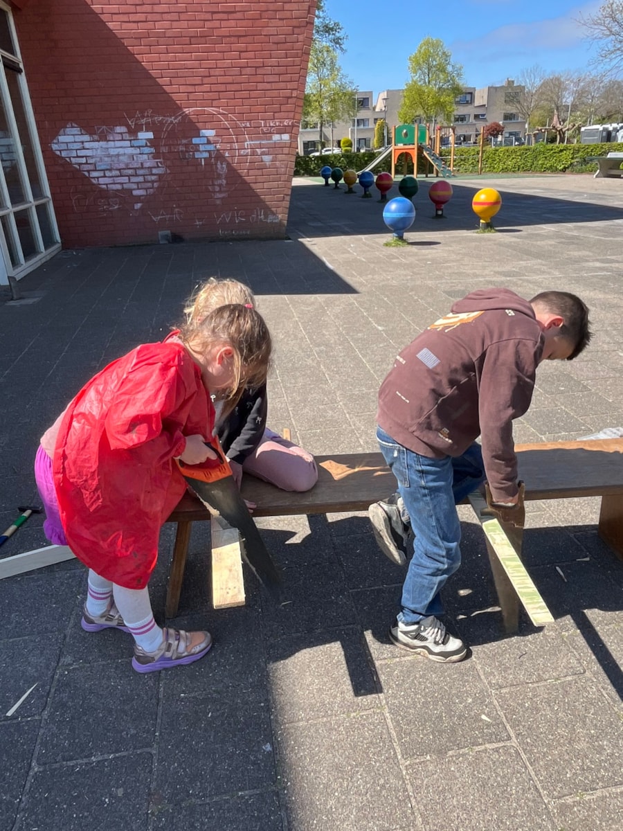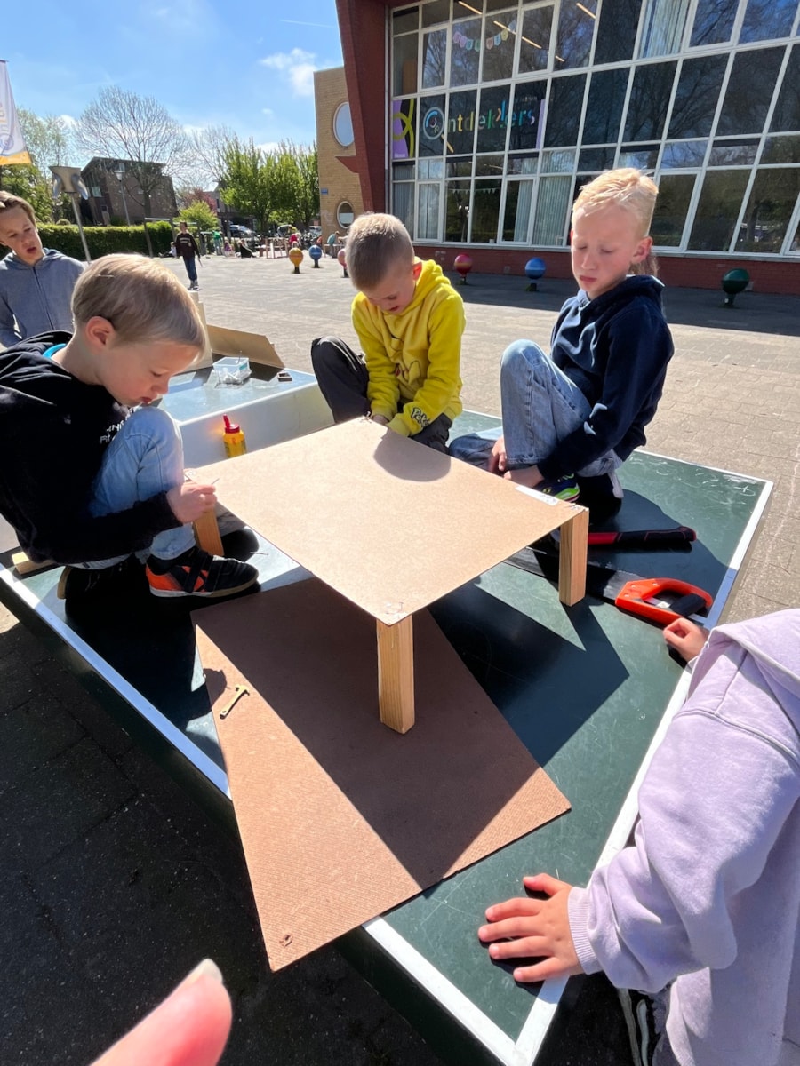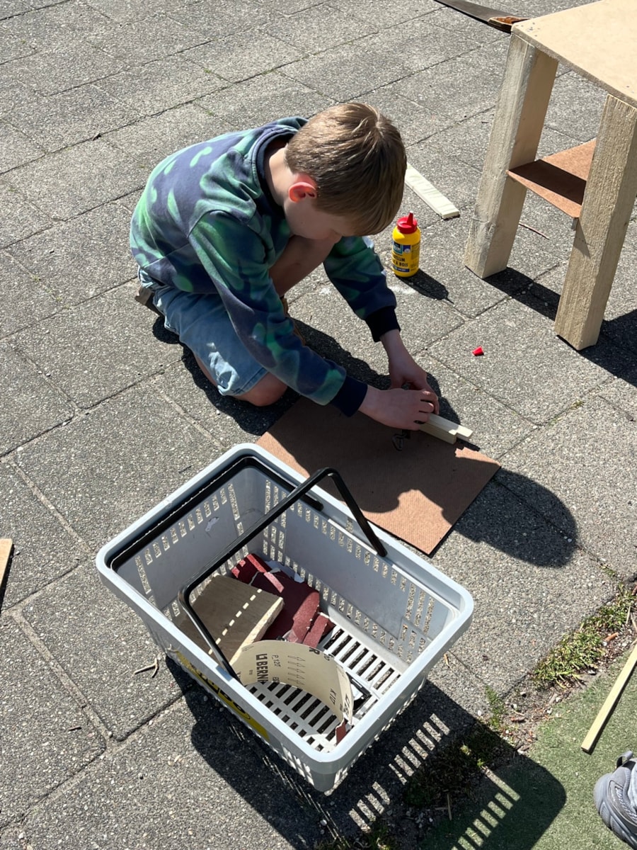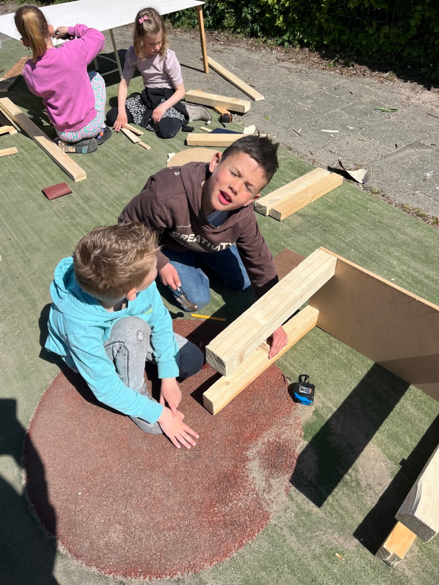 Wij hebben deze week heerlijk buiten aan de meubels gewerkt! Ze zijn bijna allemaal in elkaar gezet. Na de vakantie gaan we stofferen en schilderen. En dinsdag gingen we natuurlijk met de trein op bezoek bij het HMC! Dat was heel leuk en leerzaam.