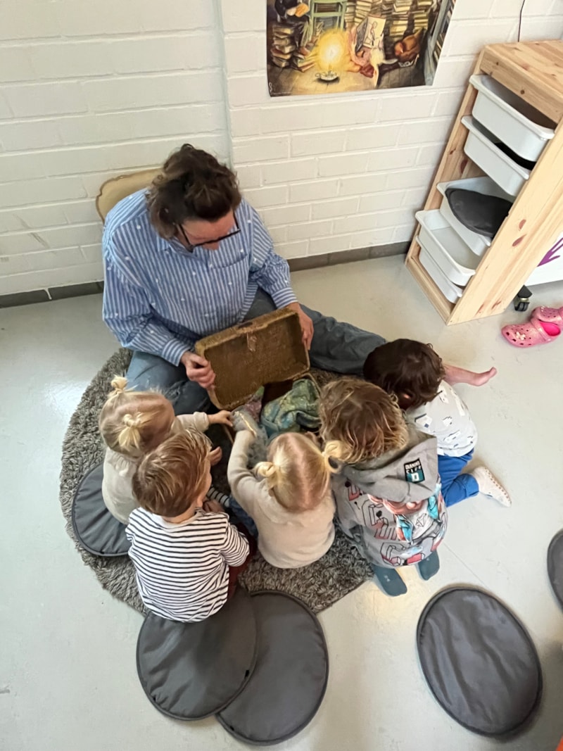 De koffer is bruin, groot, zwaar en… op slot. Wat zou er inzitten? De kinderen voelden aan de koffer, tilden de koffer op, keken stiekem in de koffer en riepen Mireille. Met onze vinger als toverstok hebben we gezongen en gezongen totdat we zeker…