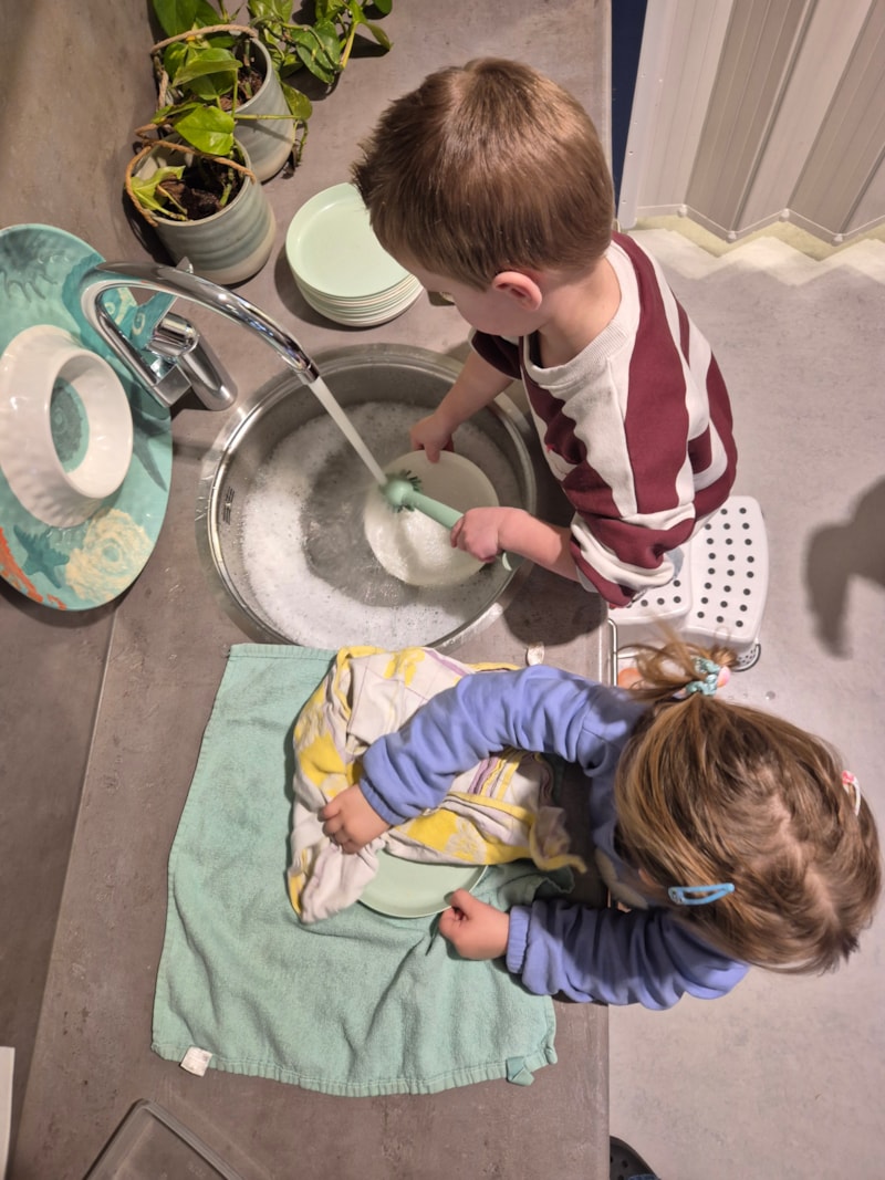 We lezen het boek kleine aap dagelijks voor en spelen in de huishoek met de Baby’s. Van de week was onze vaatwasser stuk. De kinderen hebben ons goed geholpen met de vaat. Toppers!