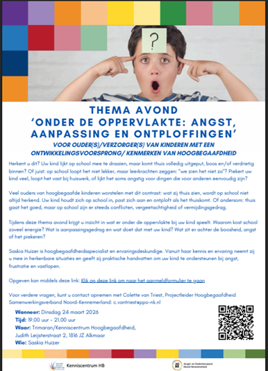 Heeft uw hoogbegaafd kind op school een ander gedrag dan thuis? Draait uw kind op school mee, maar komt thuis uitgeput, boos of verdrietig binnen? Of gaat het thuis goed, maar ontstaan er op school steeds conflicten of vermijdingsgedrag?